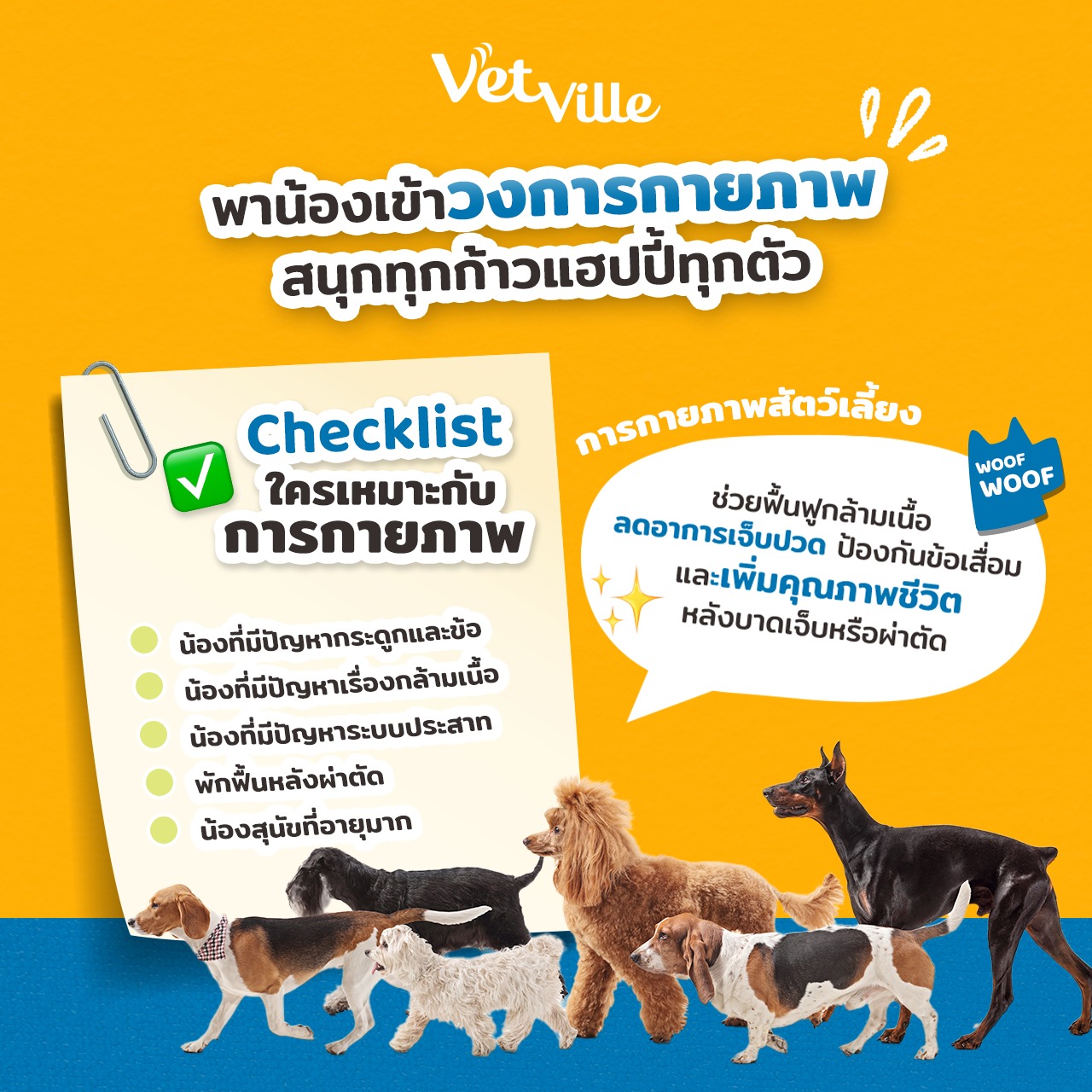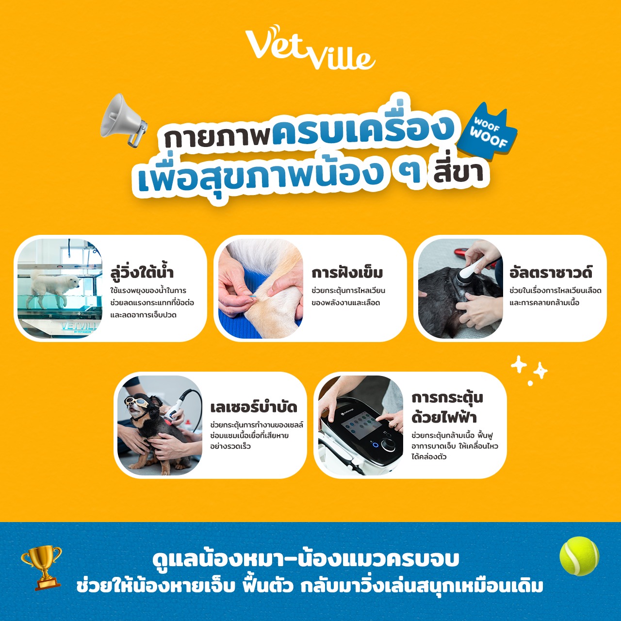 ที่เว็ทวิลล์ เราเชื่อว่าการฟื้นฟูร่างกายหลังเจ็บป่วยหรือผ่าตัดคือกุญแจสำคัญที่จะช่วยให้สัตว์เลี้ยงกลับมาเคลื่อนไหวได้อย่างมั่นใจ ศูนย์การรักษาของเรามุ่งเน้นการดูแลสัตว์เลี้ยงอย่างครบวงจร ตั้งแต่การประเมินสภาพร่างกาย วินิจฉัยสุขภาพ การจัดโปรแกรมกายภาพบำบัดเฉพาะตัว ไปจนถึงการลดอาการเจ็บปวดและอักเสบ และฟื้นฟูสมรรถภาพร่างกายของน้อง ๆ อย่างต่อเนื่อง